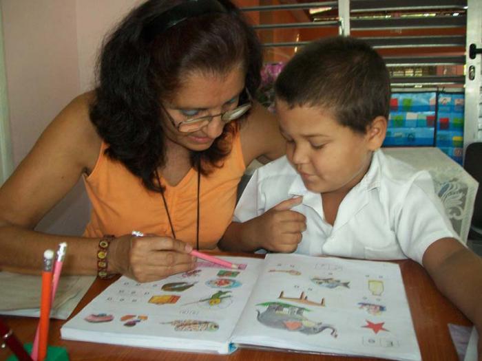 En la de primer grado la maestra María Elena Pérez abraza con cariño a Cristian Miguel Mojena, mientras le conduce la mano para ayudarlo a escribir algunas vocales. Su propósito es llevarlo a la concentración, cosa que logra. Luego relata: “Cuando llegó a la escuela se comunicaba por gestos y hoy empieza a manifestar un lenguaje coherente con oraciones simples. Ya identifica las ilustraciones y las figuras geométricas, compara conjuntos y reconoce los números del uno al diez”.