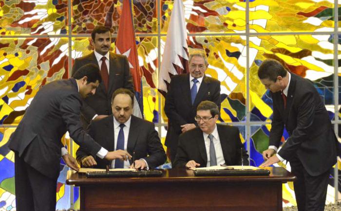 Cuba y Catar ratificaron ayer su voluntad de ampliar los vínculos de cooperación mediante la firma de dos acuerdos, ceremonia a la que asistieron el General de Ejército Raúl Castro Ruz, Presidente de los Consejos de Estado y de Ministros, y el Emir del Estado de Catar, Jeque Tamim Bin Hamad Al-Thani.
