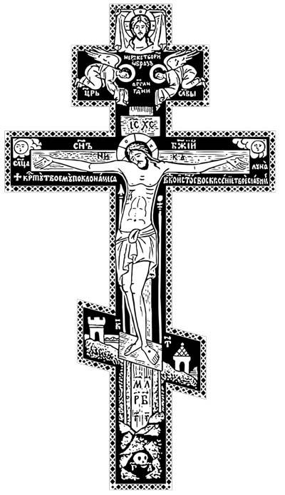 CRUZ ORTODOXA Tiene en la parte superior un pequeño travesaño que recuerda la inscripción: “Jesús Nazareno, Rey de los Judíos”. Incluye también un travesaño en los pies del Salvador que hace referencia a los dos ladrones crucificados al lado de Cristo. El del lado alzado significa el ladrón que se arrepintió y entró en el paraíso, mientras que el otro extremo representa el ladrón que blasfemaba y pereció. |