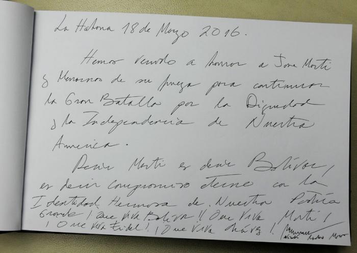 “Hemos venido a honrar a José Martí y llenarnos de su fuerza para continuar la gran batalla por la dignidad y la independencia de Nuestra América. Decir Martí, es decir Bolívar, es decir compromiso eterno con la identidad de nuestra Patria Grande. ¡Qué viva Bolívar! ¡Qué viva Martí! ¡Qué viva Fidel! ¡Qué viva Chávez!”, firmó en el libro de visitantes de la institución.