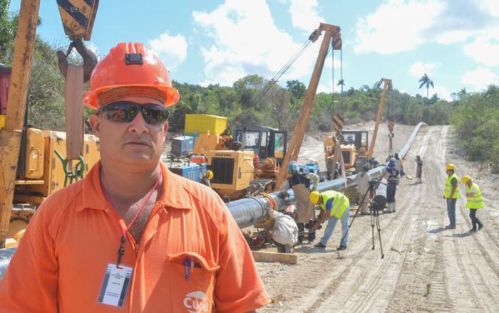 El soldador Yuniel Conzo Rodríguez, de 34 años, relata que su labor es unir los tubos con un diámetro de 20 pulgadas bajo una norma tecnológica de cuatro pasos. Para ello tuvo que ser avalado por expertos internacionales y cada dos años lo someten a evaluaciones de la actividad.