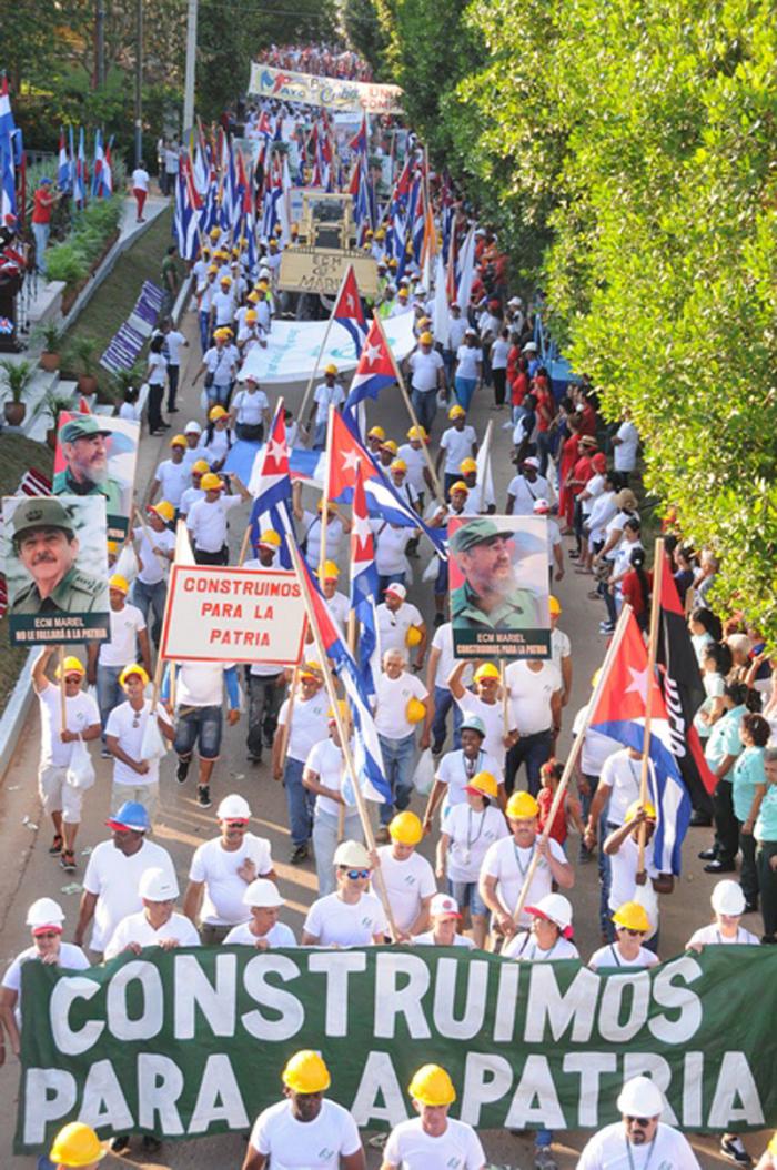 En el Día Internacional de los Trabajadores, con el protagonismo de jóvenes, obreros estatales y no estatales, unidos al pueblo en sentido general, se alzaron banderas y pancartas alegóricas a la fecha, en representación de los 17 sindicatos.