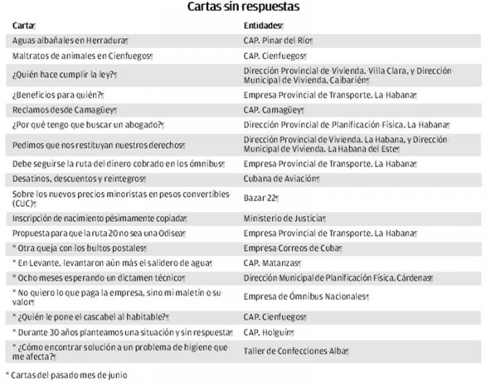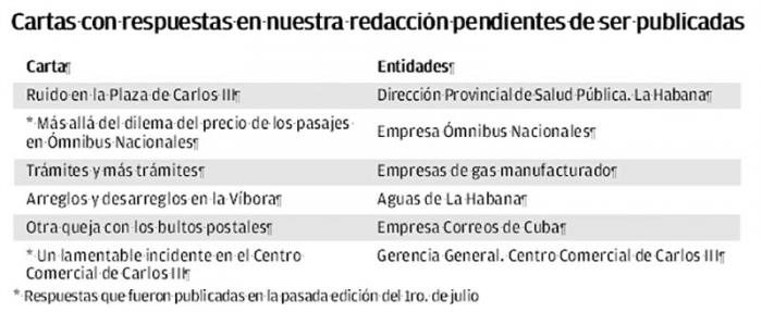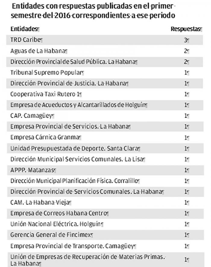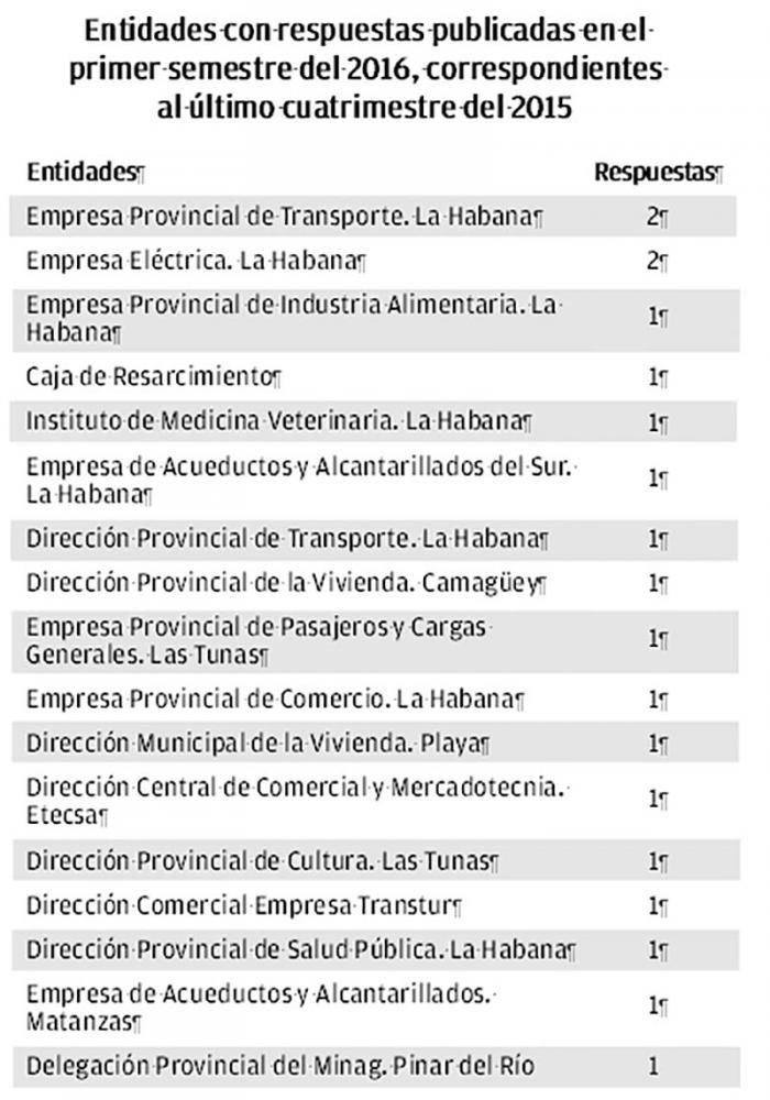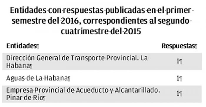 Hoy, en la etapa que analizamos aparecieron en nuestras páginas 77 cartas de los lectores y 55 contestaciones de las instituciones, de ellas 18 correspondientes al último cuatrimestre del 2015 y tres al segundo de ese calendario. Además, otras seis respuestas de igual cantidad de entidades están en nuestra redacción, pendientes de ser publicadas. Dos ya aparecieron el pasado viernes 1ro. de julio, firmadas por la Empresa Ómnibus Nacionales y la Gerencia General del Centro Comercial de Carlos III, por lo cual en el venidero balance saldrían como respuestas publicadas.