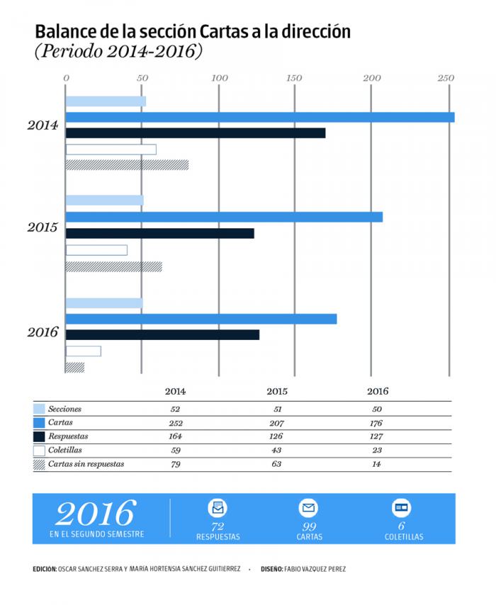 Es visible también cómo el número de cartas sin respuestas se viene reduciendo exponencialmente desde que el 9 de mayo del 2014, la sección estrenó estos resúmenes. En el 2016 el número de opiniones sin respuestas muestra una significativa disminución, incluso en el segundo semestre, solo 11 quedaron pendientes.