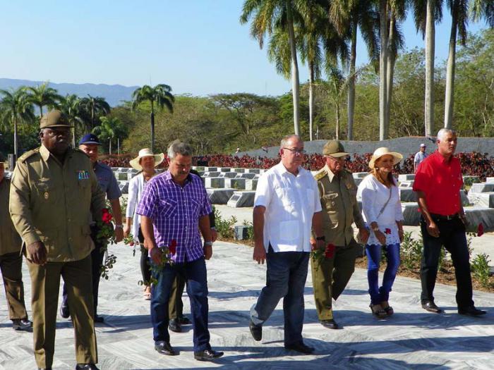 Durante el acto político y ceremonia militar efectuados en el mausoleo erigido en la base de loma de Mícara, fueron colocadas al pie de la llama eterna que perpetua la memoria de los mártires del frente de lucha, sendas ofrendas florales a nombre del General de Ejército Raúl Castro Ruz, de los Consejos de Estado y de Ministros, y del pueblo de Cuba.