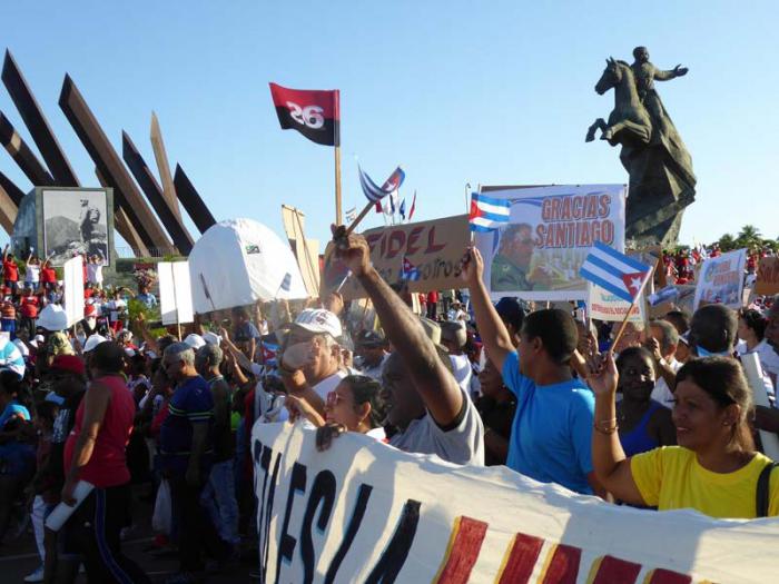 SANTIAGO DE CUBA.-Nuestro eterno Comandante en Jefe Fidel Castro Ruz, marchó en los corazones de los más de 300 000 trabajadores santiagueros y sus familiares, que encabezados por el segundo secretario del Comité Central del Partido, José Ramón Machado Ventura, hicieron vibrar la Plaza de la Revolución Mayor General Antonio Maceo Grajales, este 1ro. de Mayo.