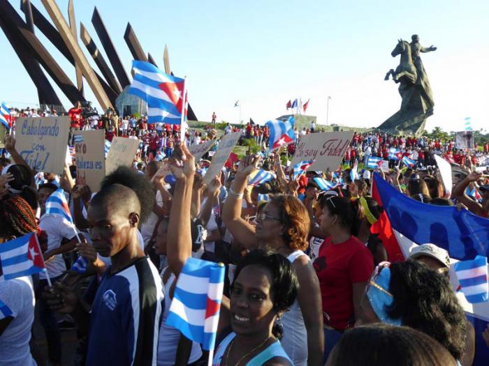 No bastó su enorme imagen con el fusil y la mochila de guerrillero, que desde el centro del auditorio convocaba a la unidad por nuevas victorias de la Revolución, porque también estaba en miles de fotos, de telas y pancartas, en lemas y consignas enarbolados durante las dos horas del desfile más masivo, colorido y entusiasta de los últimos años.