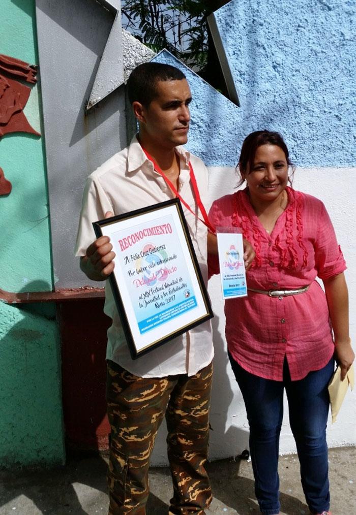La primera secretaria el Comité Nacional de la UJC, Susely Morfa González, miembro del Comité Central del Partido y del Consejo de Estado, entregó el reconocimiento y la credencial que acredita a Félix como delegado directo a la cita juvenil y le trasmitió una felicitación portener el honor de representar a la juventud cubana en la magna cita, dijo la dirigente juvenil.