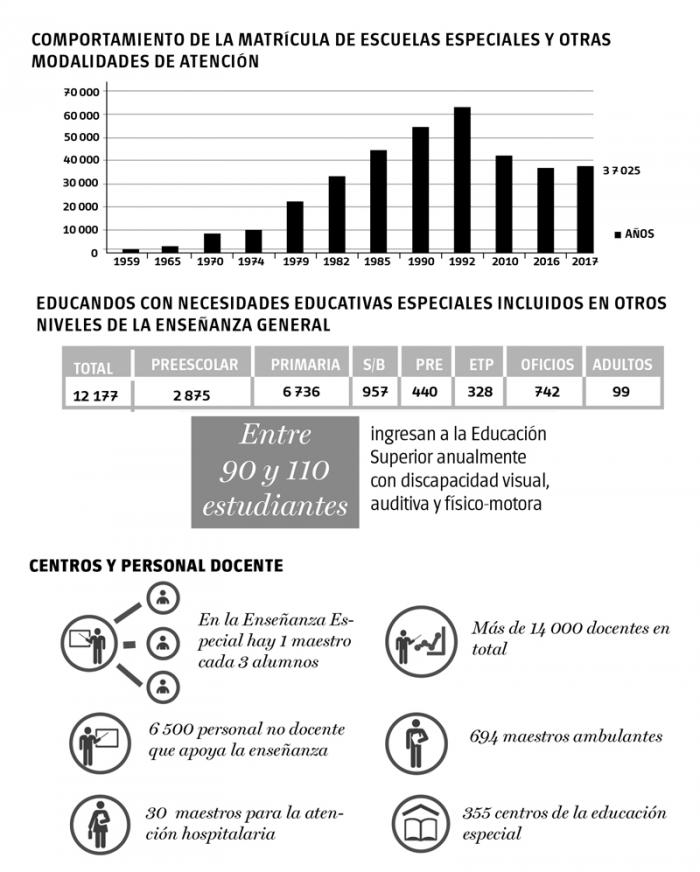 En esos términos, así como en materia de igualdad y equidad —valores claves de la educación especial en Cuba—, las cifras pueden ser reveladoras, mas la mejor evidencia se encuentra en la actuación de los maestros, sicopedagogos, logopedas; en los alumnos que aprenden ya sea en una escuela regular o especial; en los recursos materiales a su disposición; en la posibilidad de transitar por los niveles de enseñanza y de alcanzar un empleo.