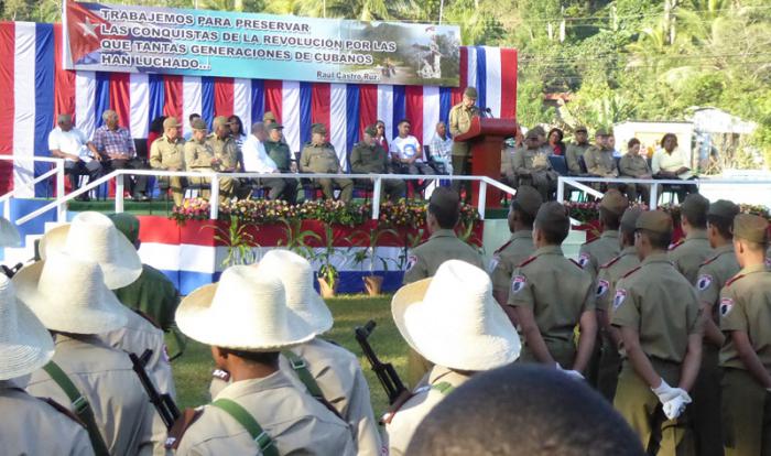 El propio lomerío localizado en pleno corazón de la Sierra Maestra, se estremecería momentos después con las 21 salvas de artillería que secundando el himno nacional interpretado por la Banda de Música del Ejército Oriental, iniciaron el tributo de pueblo y las tropas formadas por bloques de infantería, tropas especiales, alumnos de la Escuela Militar Camilo Cienfuegos, de Bayamo, y combatientes del Ejército Juvenil del Trabajo, en el combinado deportivo del poblado cabecera de Cruce de los Baños.