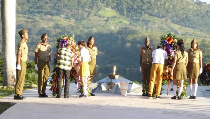 El mausoleo donde la historia de luchas y victorias, perdura en la presencia de los restos de Almeida y de muchos de sus combatientes caídos en la guerra o fallecidos después de la victoria, acogió el primer homenaje en la fecha mediante las ofrendas florales que a nombre del General de Ejército Raúl Castro Ruz y del pueblo de Cuba, fueron depositadas al pie de la llama eterna que arde en lo alto de Loma La Esperanza.