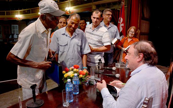 Acompañado por Abel Prieto Jiménez, ministro de Cultura, y de Julio Lima Corzo y Alberto Lopez Díaz, máximas autoridades del Partido y el Gobierno en el territorio, respectivamente; el prestigioso intelectual franco-españolexplicó alos presentes en el Teatro La Caridadel arduo trabajo realizado, que incluyó la ampliación del texto original con dos nuevos materiales: «Dos horas más con Fidel» y «Fidel Castro y la represión de los intelectuales».