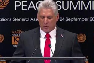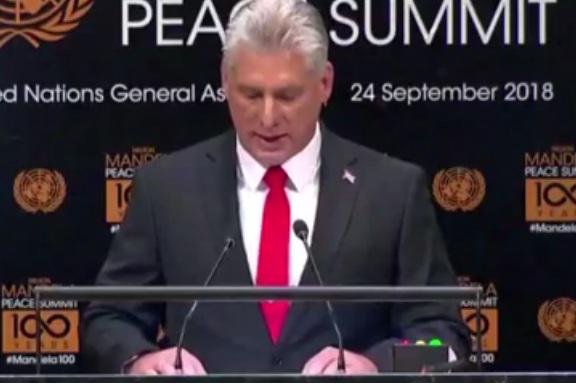 11:10-. Inicia discurso del Presidente de los Consejo de Estado y de Ministros, Miguel Díaz-Canel Bermúdez en la Cumbre por la Paz Nelson Mandela en la sede de las Naciones Unidas en Nueva York.
