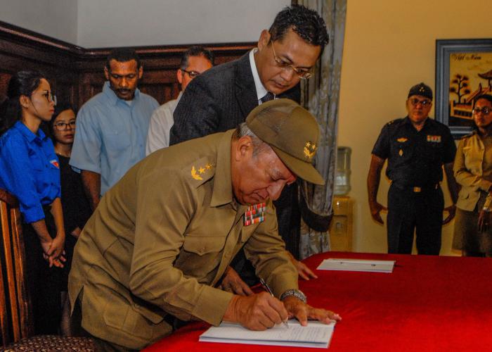 Así se puede leer en el libro de condolencias, abierto en la embajada de la República Socialista de Vietnam en Cuba, por el fallecimiento de su presidente, y que fue firmado en la mañana de este miércoles, en nombre del pueblo y Gobierno cubanos, por José Ramón Machado Ventura, Segundo Secretario del Partido y Salvador Valdés Mesa, primer vicepresidente de los Consejos de Estado y de Ministros.