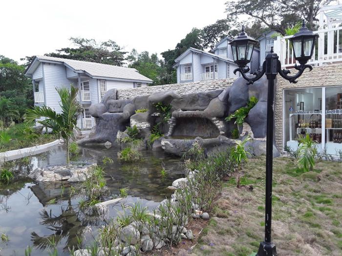 Durante el recorrido y en especial desde el mirador, se distinguen las cabañas y los restantes objetos de obra, hechos de madera o de una imitación de ese material, de tecnología brasileña, dispuestos cuidadosamente en el lomerío perfumado por cafetos y tapizado por árboles y arbustos, de un verdor favorecido por el microclima existente.