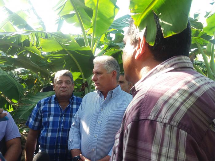 Miguel Díaz-Canel, comprobó en la unidad productiva Capitán Lawton, la atención cultural a las plantaciones de plátano bajo un sistema de ferti -riego, tecnología moderna que favorece el crecimiento y productividad del renglón, del cual se aspira llegar a más de un centenar de hectáreas bajo ese sistema en el Municipio Especial.