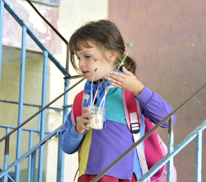 Le pregunto a las maestras si el Martí estuvo firme todo el tiempo o si lo pusieron en su pedestal luego del caos, y me dicen que «increíblemente no se movió». Una de las niñas bajo su guarda llama mi atención porque no carga ningún libro. En sus manos lleva celosa un germinal bien cuidado, de esos que se logran poniendo frijoles en un pomo con algodón húmedo y que, ante los ojos del adulto, es la tarea obligada del año, la que todos hicimos alguna vez; pero que allí, contra su pecho menudo, parece un amigo al que se salva y parece un monte.