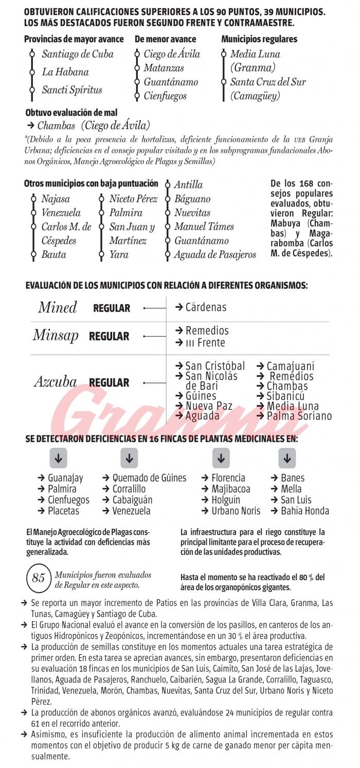 Durante el recorrido número 83 del Grupo Nacional que rige esta actividad, efectuado entre el 1ro. de marzo y el 16 de abril últimos, se pasó revista nuevamente en todas las provincias y municipios, incluyendo la Isla de la Juventud, a las tareas productivas y de apoyo de los 19 subprogramas que gestiona el movimiento.