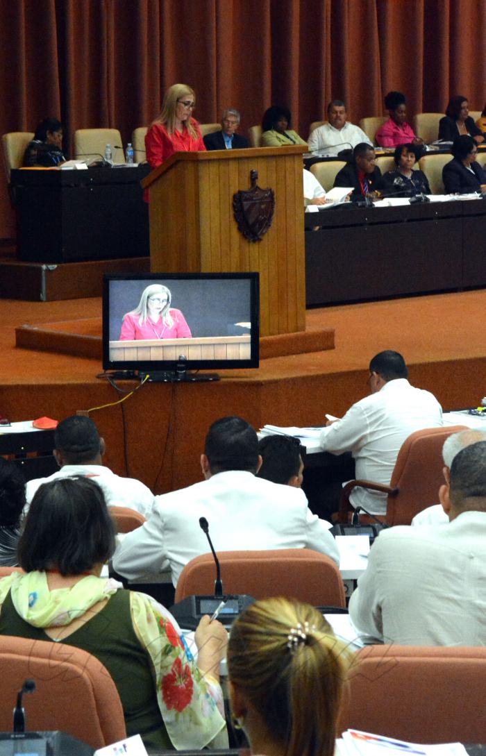 La Ministra de Finanzas y Precios Meisi Bolaños Weiss lee el dictamen de las Comisiones de Asuntos Económicos y Asuntos Constitucionales y Jurídicos sobre el Informe de Liquidación del Presupuesto del Estado del año 2018.