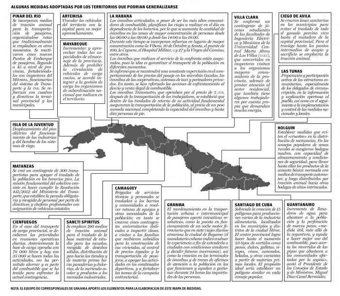 El reordenamiento en la trasportación urbana e intermunicipal de pasajeros aportó iniciativas resolutivas, como la puesta en funcionamiento de un coche motor ferroviario que en siete viajes diarios atraviesa la ciudad de Bayamo (el mandatario cubano indicó evaluar la experiencia a fin de extenderla a ciudades con condiciones similares y decidir futuras inversiones), así como la creación en las terminales de ómnibus y de trenes de oficinas de atención a la población en las que funcionan y ayudan a gestionar durante 24 horas las inquietudes de las personas.