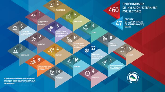 En la Cartera se sitúa con claridad a la ZED Mariel dentro del eje estratégico de transformación productiva e inserción internacional, con sus potencialidades para el mundo empresarial. También, define los sectores estratégicos para la inversión extranjera en el país: construcción; electroenergético; energías renovables; telecomunicaciones, tecnologías de la información e incremento de la conectividad; transporte; turismo, incluyendo salud; producción de alimentos; industria farmacéutica y biotecnología; agroindustria azucarera y sus derivados, entre otros.