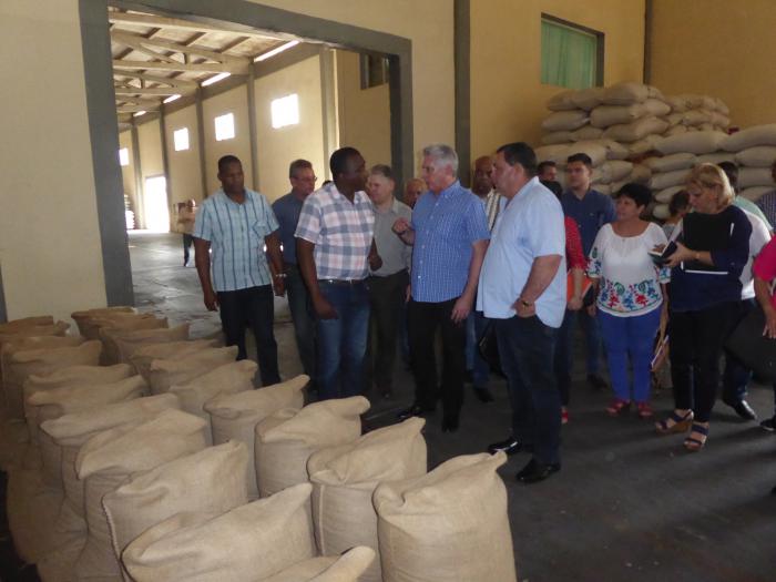 El Presidente cubano recorrió áreas de la procesadora e intercambió con los trabajadores, y recordó a los directivos y técnicos de la Eladio Machín que ellos son los responsables de promover y garantizar el éxito del programa de desarrollo de café en el llano.