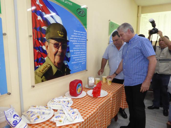 Un recorrido por las diversas áreas de la Empresa Láctea Escambray, igualmente ubicada en Cumanayagua, le posibilitó al mandatario y al equipo de trabajo que le acompaña aquilatar el inmenso esfuerzo diario acometido aquí para respaldar significativos destinos sociales a través de la entrega de leche, yogur y otras producciones.