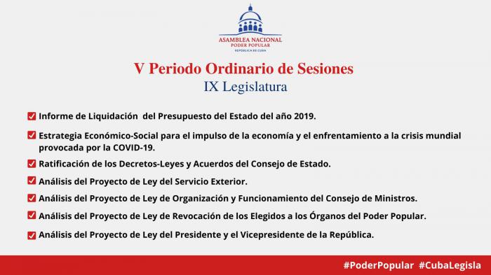 La agenda incluye la presentación del Informe de la liquidación del Presupuesto del año 2019 y su respectivo Dictamen; la actualización sobre la Estrategia económica y social para impulsar la economía y hacerle frente a la crisis mundial provocada por la COVID-19; también la ratificación de los decretos leyes y acuerdos aprobados por el Consejo de Estado en el periodo, y la presentación de cuatro proyectos de leyes.