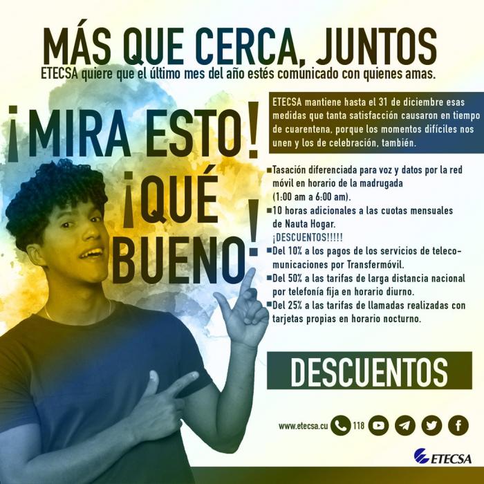6:00 a.m.); diez horas adicionales a las cuotas mensuales de Nauta Hogar; descuentos del diez por ciento a los pagos de los servicios de telecomunicaciones por Transfermóvil, del 50 por ciento a las tarifas de larga distancia nacional por telefonía fija en horario diurno, y del 25 por ciento a las llamadas
