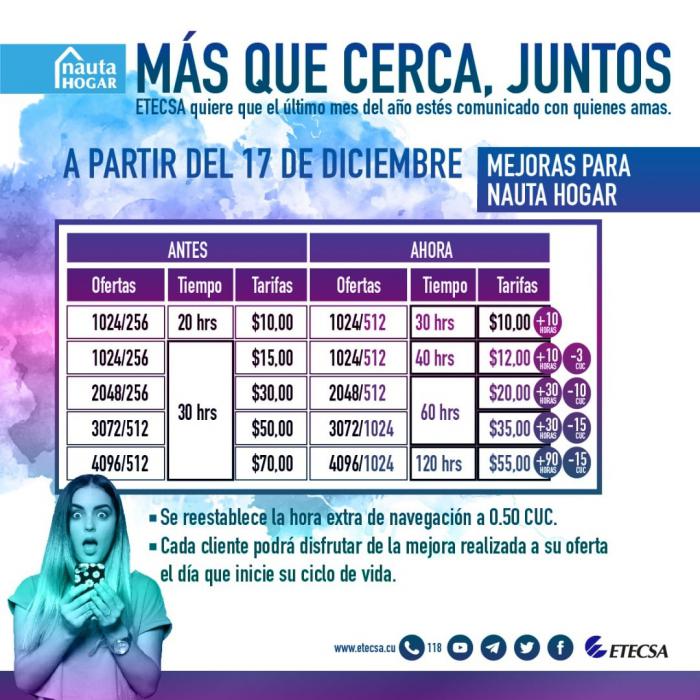 En este punto es necesario aclarar que la oferta inicia el 17 de diciembre, pero se activará el día del comienzo del ciclo de vida del servicio de cada usuario. Es decir, por ejemplo, si usted tiene contratado el Nauta Hogar con fecha de facturación el día 26 de cada mes, hasta esa fecha no recibirá las mejoras incorporadas a la oferta que tiene contratada. Asimismo, Jiménez Ruiz comentó que cuando entren en vigor estas nuevas tarifas para Nauta Hogar se restablece la facturación de la hora extra de navegación a 0.50 CUC.