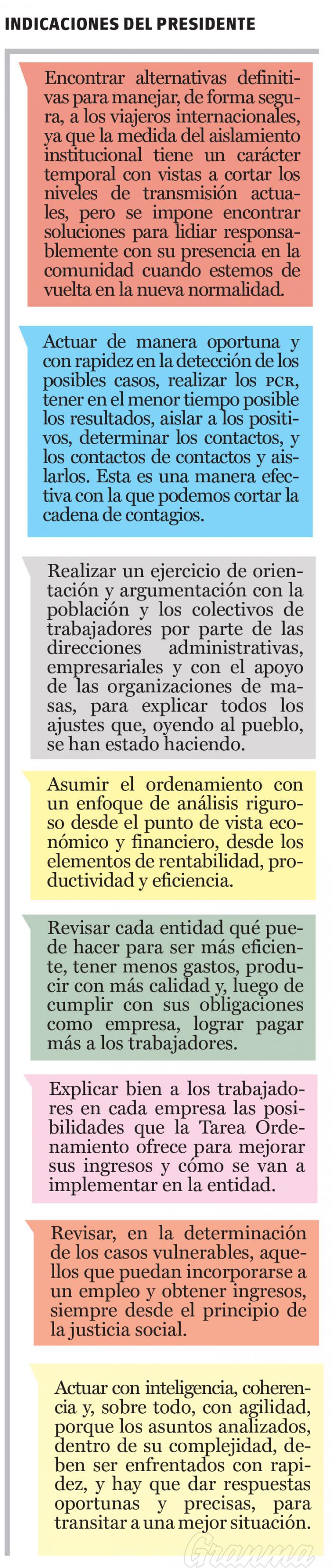 Durante el análisis de temas relacionados con la producción de alimentos, el Presidente cubano refirió «si tenemos más alimentos importamos menos, podremos encadenar la industria nacional con la producción agropecuaria e importaremos menos conservas y productos elaborados, exportaremos alimentos que nos den dinero para importar lo que no podemos producir, bajarán los precios, podremos controlar la inflación que se genera con el ordenamiento y al final habrá más calidad de vida».
