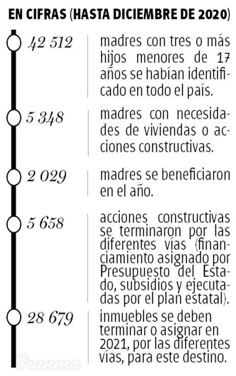 En el caso de Villa Clara, la situación no es diferente, según refirió María del Carmen González Otero, directora de la Vivienda en el territorio, quien comentó que en la provincia existen 1 827 madres, con tres o más hijos, que tienen necesidades constructivas, a quienes se les busca alguna solución, ya sea a través de la entrega de subsidios para la fabricación de células básicas habitacionales y las rehabilitaciones, o mediante la construcción de viviendas por la vía estatal.