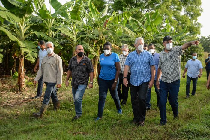 El primer punto del recorrido fue un área perteneciente al municipio de San Nicolás de Bari, donde el productor Osvaldo Fuentes contó al Presidente Díaz-Canel que la finca al frente de la cual él está trabajando comenzó a fomentarse hace poco más de un año. Hubo que limpiar todo, desmontar —como se dice a quitar la vegetación que dio paso a un terreno donde hoy se dan el plátano y el maíz—. Los beneficios, según explicó el productor, son palpables: