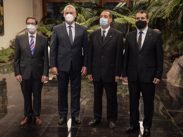 Acompañado del miembro del Buró Político y ministro de Relaciones Exteriores, Bruno Rodríguez Parrilla, el Jefe de Estado recibió, primeramente, al excelentísimo señor Abdelkrim Benchiah, de la República Argelina Democrática y Popular, a quien el dignatario habló sobre las históricas relaciones promovidas por los líderes de la Revolución argelina, así como por el Comandante en Jefe Fidel Castro Ruz y por el General de Ejército Raúl Castro Ruz.