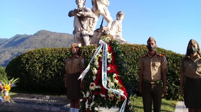 TERCER FRENTE, Santiago de Cuba. -Ofrendas florales a nombre del líder de la Revolución, General de Ejército Raúl Castro Ruz, y del Primer Secretario del Comité Central del Partido y Presidente de la República, Miguel Díaz-Canel Bermúdez, encabezaron el homenaje dedicado al Comandante de la Revolución Juan Almeida Bosque en esta serranía, al cumplirse 95 años de su natalicio.