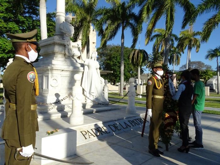 Para quien no ha reposado desde aquel 10 de octubre de 1868, en que proclamó la libertad a sus esclavos y emprendió esta Revolución que sigue adelante, fue depositada la ofrenda floral dedicada por los cubanos ante el monumento funerario de mármol blanco que en la senda patrimonial de los fundadores de la nación lo eterniza, en el cementerio Santa Ifigenia, de esta ciudad.