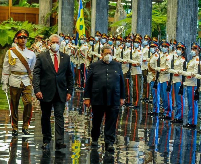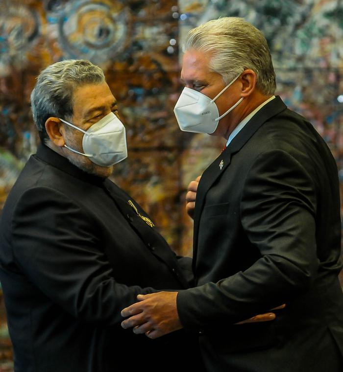 Gratitud por su tiempo, y por su deseo de realizar una visita oficial a Cuba estuvieron entre las palabras que el Primer Secretario del Comité Central del Partido Comunista y Presidente de la República, Miguel Díaz-Canel Bermúdez, extendió este jueves al honorable doctor Ralph Everard Gonsalves, primer ministro y ministro de Relaciones Exteriores, Seguridad Nacional, Asuntos Legales e Información de San Vicente y las Granadinas.