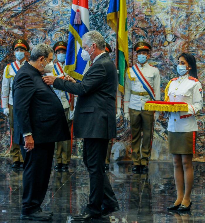 El dignatario hizo énfasis en que se trata de «la más alta condecoración del Estado cubano a las personas, a los amigos de Cuba, a los que como tú han desarrollado en muchos años de su vida una amistad incondicional y una solidaridad eterna con nuestro pueblo y con nuestro país».