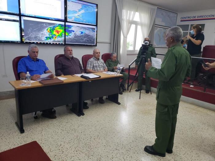 El Primer Secretario del Comité Central del Partido Comunista de Cuba y Presidente de la República, Miguel Díaz-Canel Bermúdez, junto al Primer Ministro Manuel Marrero Cruz y el secretario de Organización del Comité Central del Partido, Roberto Morales Ojeda, se encuentran el Estado Mayor Nacional de la Defensa Civil.