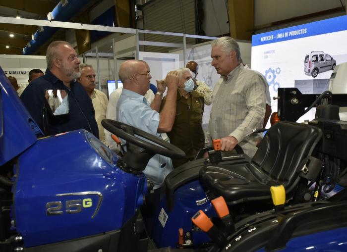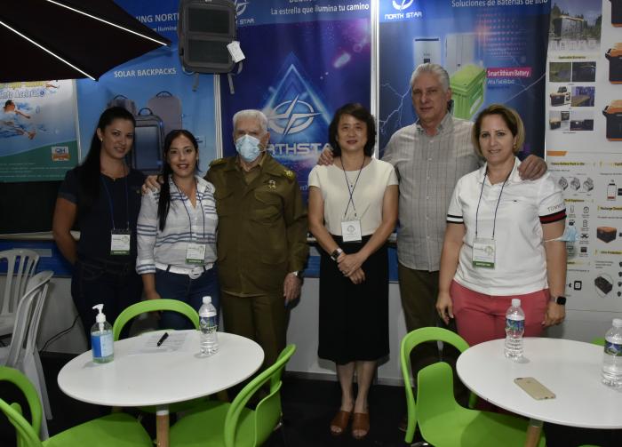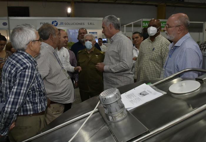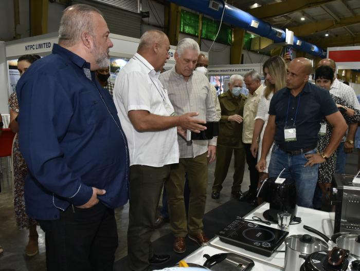 Acompañado por el miembro del Buró Político y primer ministro, Manuel Marrero Cruz; el vice primer ministro y Comandante de la Revolución, Ramiro Valdés Menéndez; y el titular de Energía y Minas, Liván Arronte Cruz; el mandatario dialogó con directivos cubanos de los grupos empresariales Gelect y Gesime, a quienes convocó a seguir el camino de las fuentes renovables de energía con productos novedosos, no solo con destino al sector estatal, sino además para los hogares.