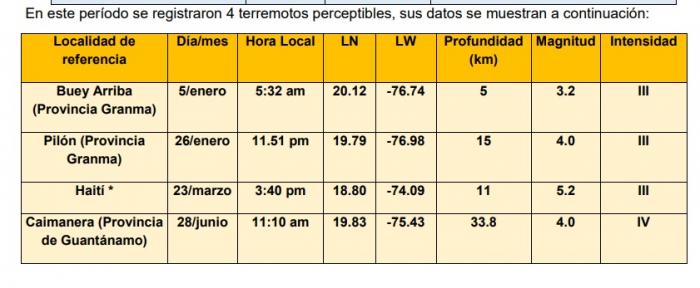 Otro, perceptible en Cuba, ocurrió el 23 de marzo en Haití, a las 3:40 pm, a una profundidad de 11 km, y con una magnitud de 5.2. Mientras, el más reciente sismo sentido por la poblcaión tuvo lugar el 28 de junio, al suroeste de Caimanera, en la provincia de Guantánamo, a las 11:10 am, a una profundidad de 33.8 km y con una magnitud de 4.0.