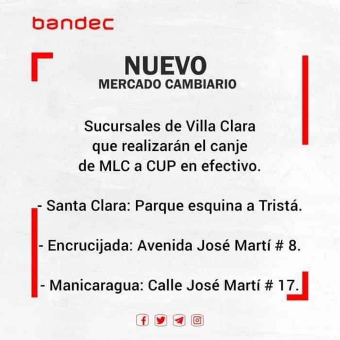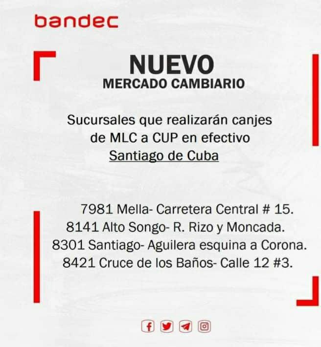 Por otra parte, el Banco de Crédito y Comercio (Bandec) dio a conocer algunos de las instalaciones donde estarán prestando este servicio, entre ellas: