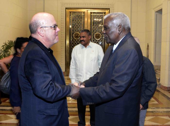 El miembro del Buró Político del Comité Central del Partido Esteban Lazo Hernández, presidente de la Asamblea Nacional del Poder Popular y del Consejo de Estado, intercambió este viernes, en el Capitolio Nacional, con los miembros de la Cámara de Representantes del Congreso de Estados Unidos de América, James Patrick McGovern, Mark Pocan y Troy Anthony Carter, quienes se encuentran de visita en nuestro país.