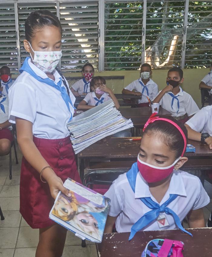 Velázquez Cobiella puntualizó que en el país se encuentra una cantidad de papel, que permitiría la producción de una parte de los cuadernos de trabajo y libros de texto. Sin embargo, recientemente dijo no haber concluido la producción y distribución de estos medios de enseñanza, y aseguró se garantizan los cuadernos de trabajo de Matemáticas y Escritura para primero y segundo grados; inglés, desde tercer grado hasta preuniversitario, y en el caso de preescolar, el cuaderno de trabajo de relaciones especiales, nociones elementales de matemática y preescritura.