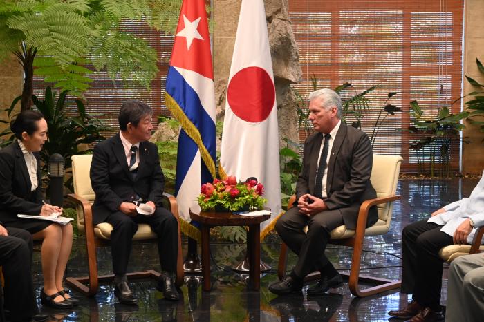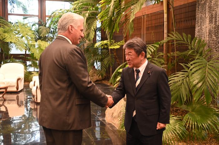 «Japón y Cuba han desarrollado en todos estos años una relación ejemplar y de respeto mutuo, de hablar con transparencia, que ha tenido el mérito de no depender de las presiones de terceros», destacó el Primer Secretario del Comité Central del Partido Comunista y Presidente de la República, Miguel Díaz-Canel Bermúdez, al dar la bienvenida este jueves, en el Palacio de la Revolución, a Motegi Toshimitsu, secretario general del Partido Liberal Democrático y excanciller de Japón.