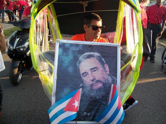 Vi estudiantes, trabajadores, combatientes; vi aquel obrero que estuvo muy enfermo y, un poco recuperado ya, llamó al jefe y le pidió que lo llevara al desfile. Y sobre el sillón de rueda lo vi pasar con una bandera cubana en alto.