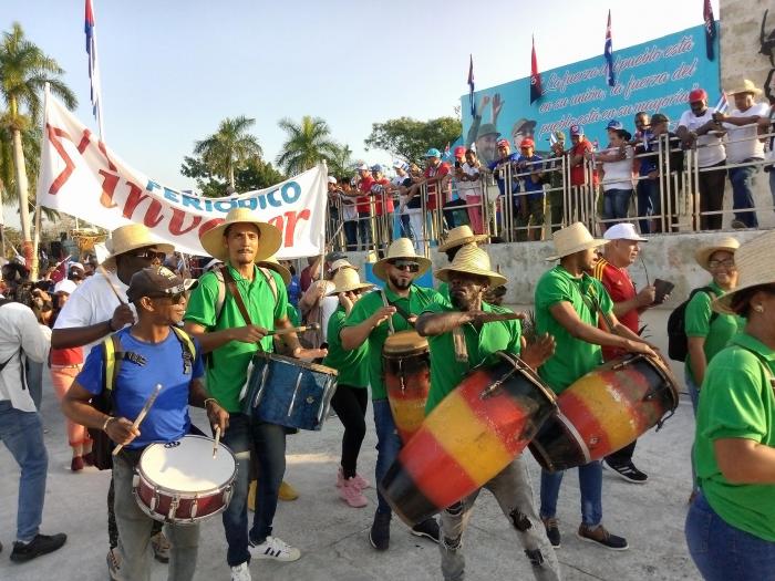 Un grupo de hombres y mujeres con instrumentos musicales (bongó,güiros, yembé y timbales, muchos timbales) pasa frente a la tribuna. La conga suena alto, alto y más alto. Y se pierden en la multitud. La fiesta de los trabajadores cubanos es tan espontánea que cuesta creer.