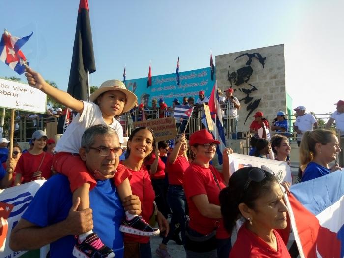 Desde la madrugada comenzaron las concentraciones previas a los desfiles. A las 7 de la mañana, tras la alocución obrera, y como siempre, en marcha unida, martiana, como la plata en las raíces de los andes, peregrinamos con nuestras banderas, consignas y competimos, los unos con los otros, por el mayor brillo y colorido de la marcha, porque los cubanos y las cubanas ponemos para la Patria las manos y el corazón.