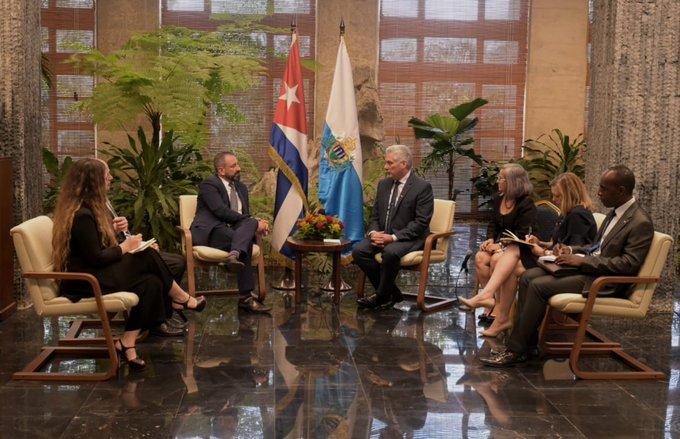 El Primer Secretario del Comité Central del Partido Comunista y Presidente de la República, Miguel Díaz-Canel Bermúdez, le expresó a Luca Beccari, secretario de Estado para las Relaciones Exteriores, la Cooperación Económica Internacional y las Telecomunicaciones y jefe de Gobierno de la República de San Marino, la voluntad política de Cuba de convertir esta visita en un futuro de ampliación y de profundización de las relaciones políticas y diplomáticas.
