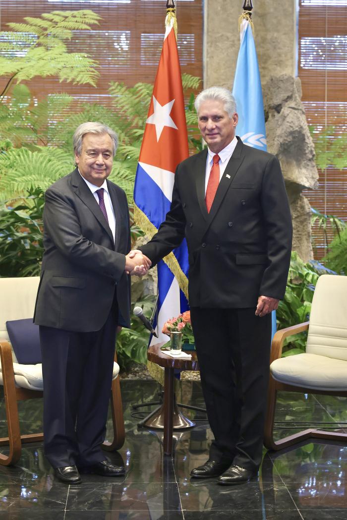«Querido amigo y excelentísimo señor António Guterres, para nosotros es un inmenso placer recibirte nuevamente en Cuba; y agradecemos el gesto de tu presencia aquí, al que le damos una alta significación», expresó el Jefe de Estado.